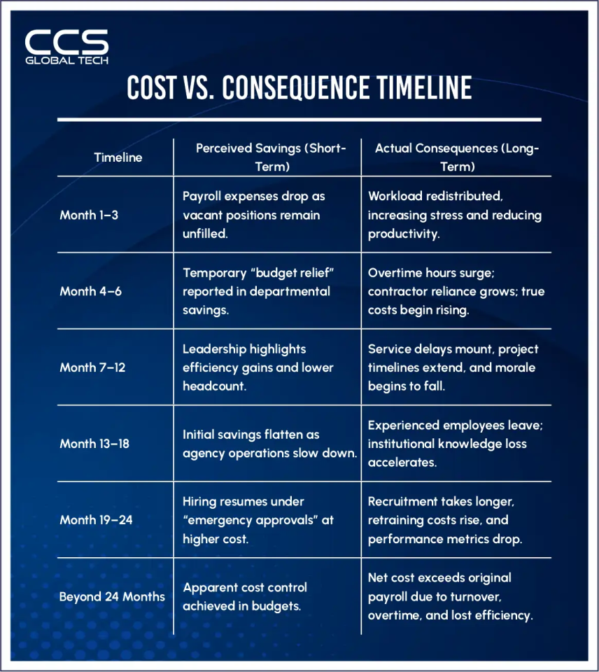 The Government Accountability Office studied this before. Their finding? Hiring freezes rarely save money. Instead: overtime costs, project delays, operational problems that cost more than the empty positions.